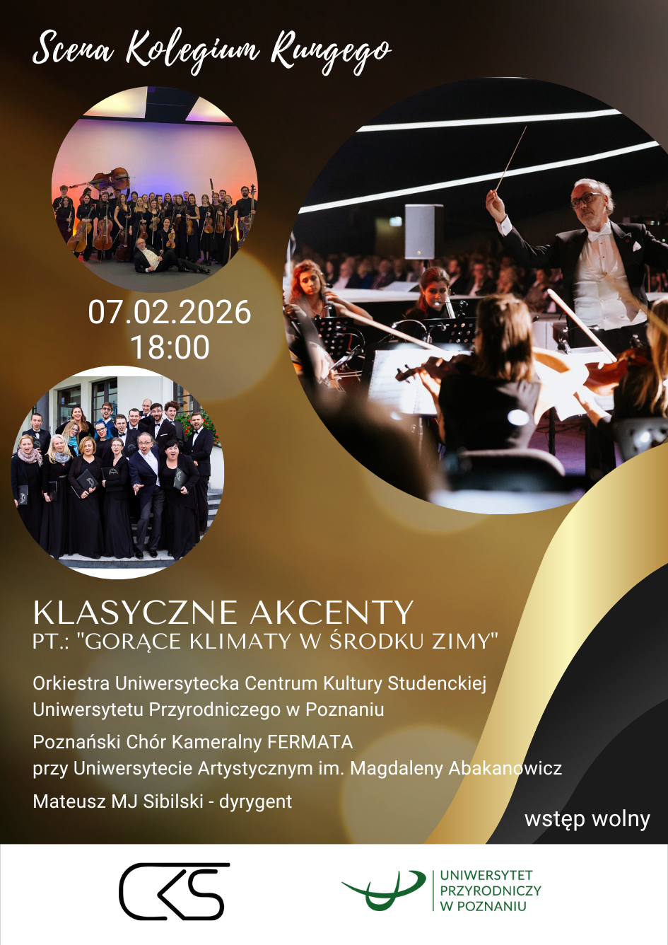 Z cyklu Klasyczne Akcenty w koncercie pt. „Gorące klimaty w środku zimy” wystąpi nasza Orkiestra Uniwersytecka CKS UPP pod dyrekcją Mateusza MJ Sibilskiego z gościnnym udziałem Poznańskiego Chóru Kameralnego FERMATA przy Uniwersytecie Artystycznym im. Magdaleny Abakanowicz w Poznaniu.  Repertuar „ogrzewający”.